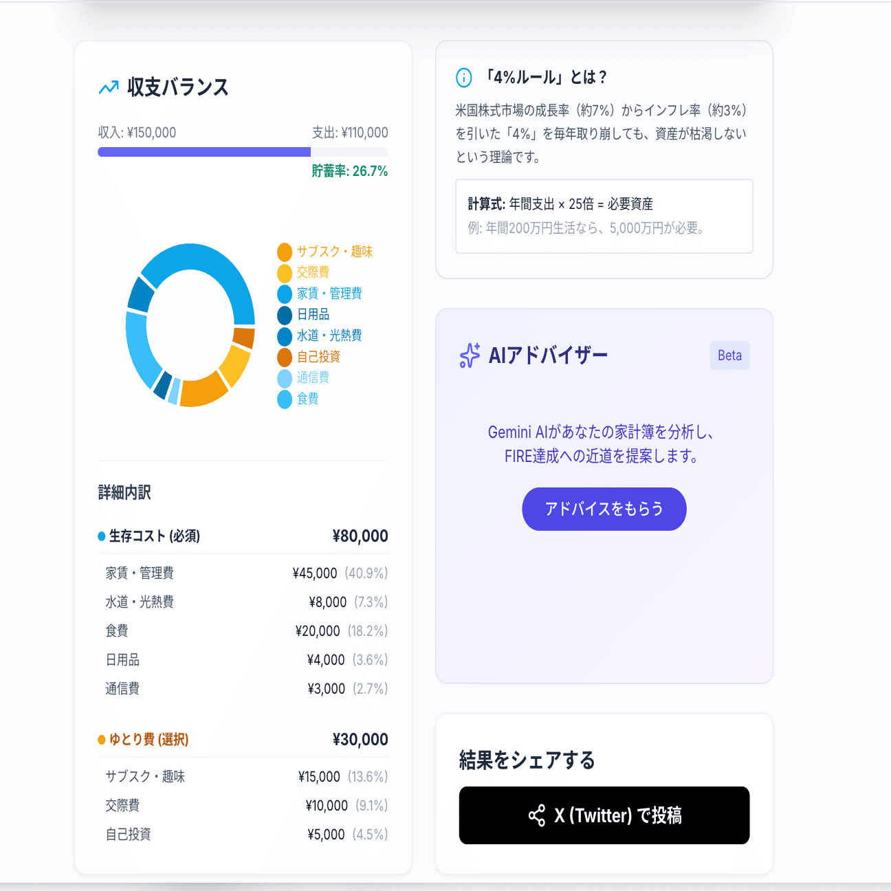 • 4%ルールに基づいて、経済的自立に必要な貯蓄額を瞬時に算出